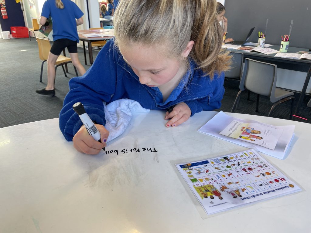 Structured literacy is taught everyday for 45minutes intensively and then integrated within other learner areas. We currently use the Sunshine Scope and Sequence as the basis for our Structured Literacy. This is a phonic based way of learning to recognise letter-sounds and then putting the sounds together to form words. The children learn the sounds in a prescribed order and once they have a minimum number of sounds under their belt, they apply their learning to specially written books.