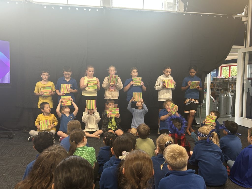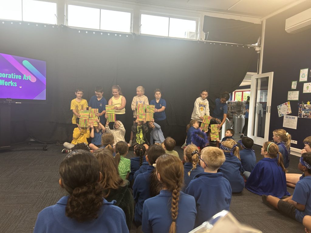 Music, Dance, Drama, and Visual arts are developed through our art program once a week. In Term 2 we have a house arts challenge in which each child works with their house to develop a piece of collaborative visual arts, dance, and song to share at the end of the term.